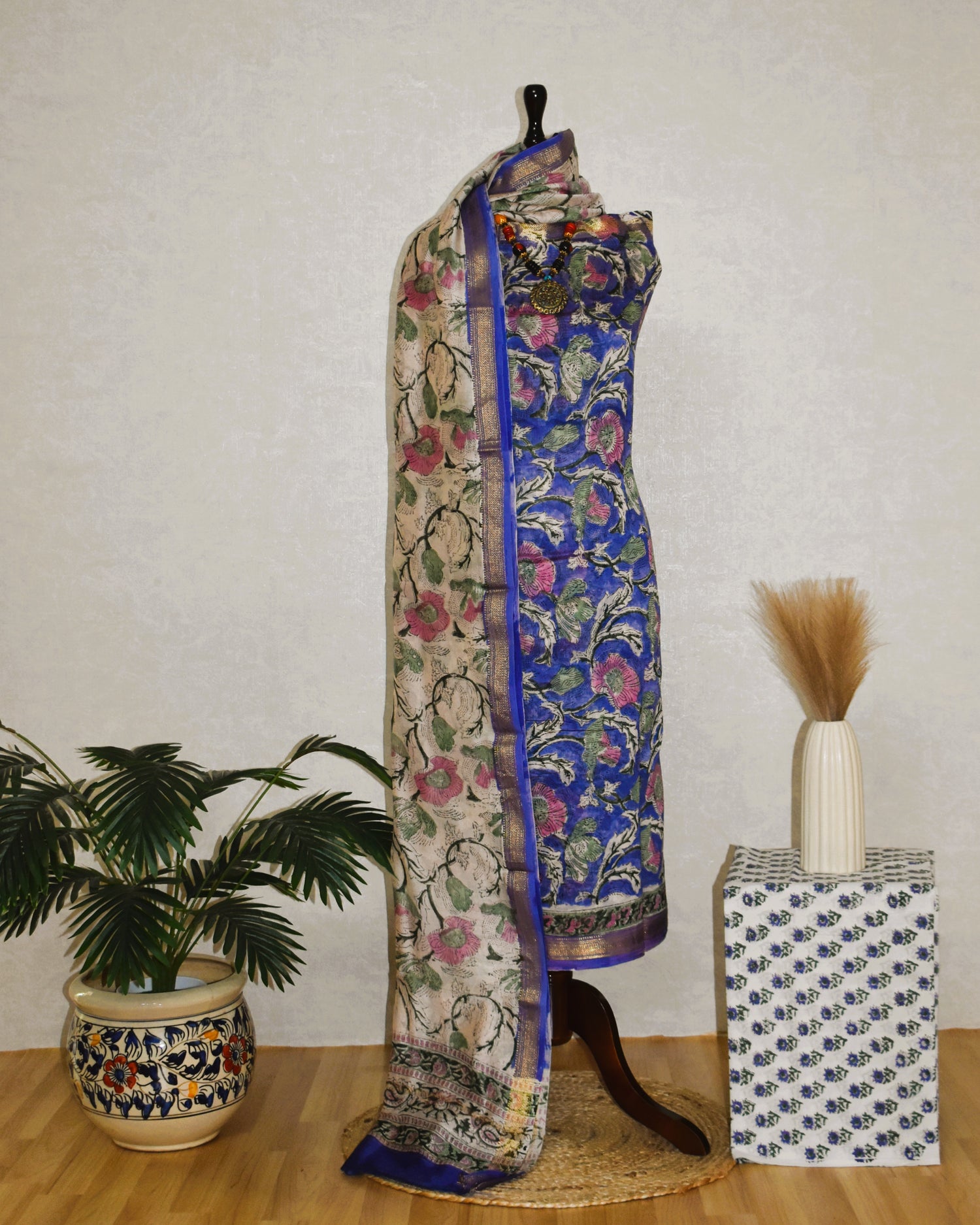 Mud-toned Sanganeri Floral print on Blue-Green Maheshwari Silk Suit Set