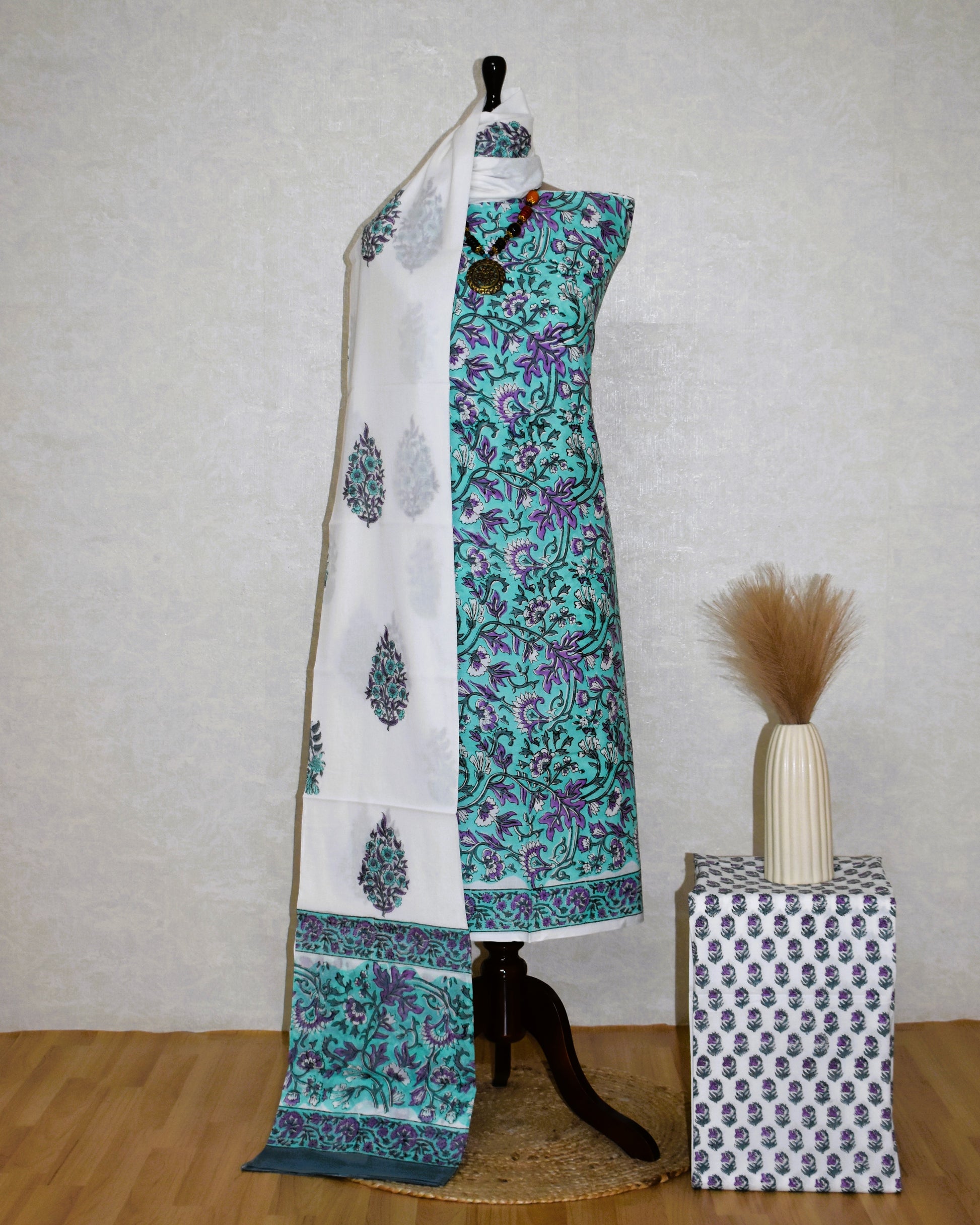 This hand block floral printed unstitched cotton suit comes with a soft malmal dupatta, offering both comfort and style. The breathable cotton fabric keeps you cool, while the unstitched design gives you the flexibility to create a fit that’s truly yours. Light, elegant, and easy to wear—perfect for everyday charm.