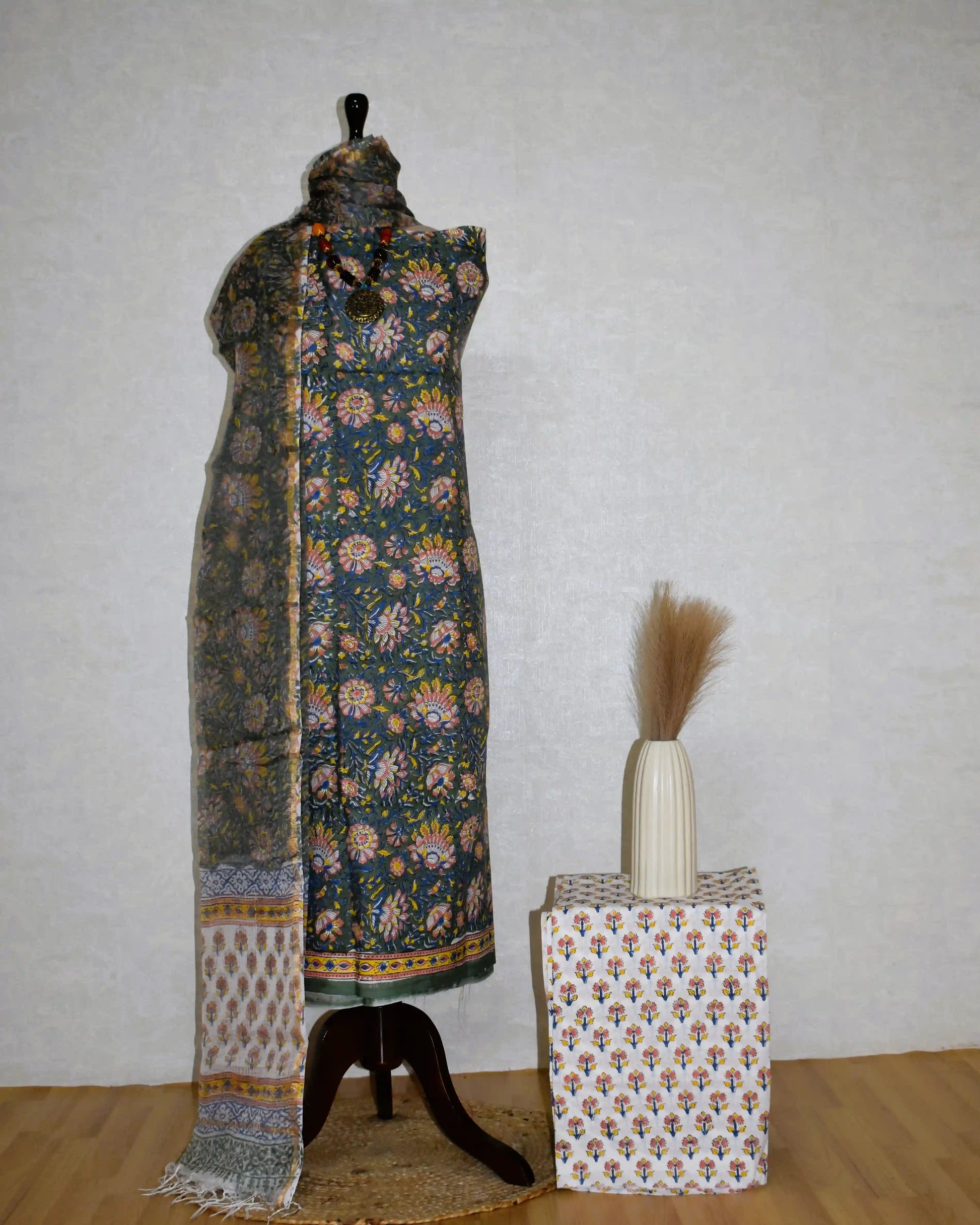 All-over Floral Hand Block Printed Cotton Suit With Kota Doria Dupatta