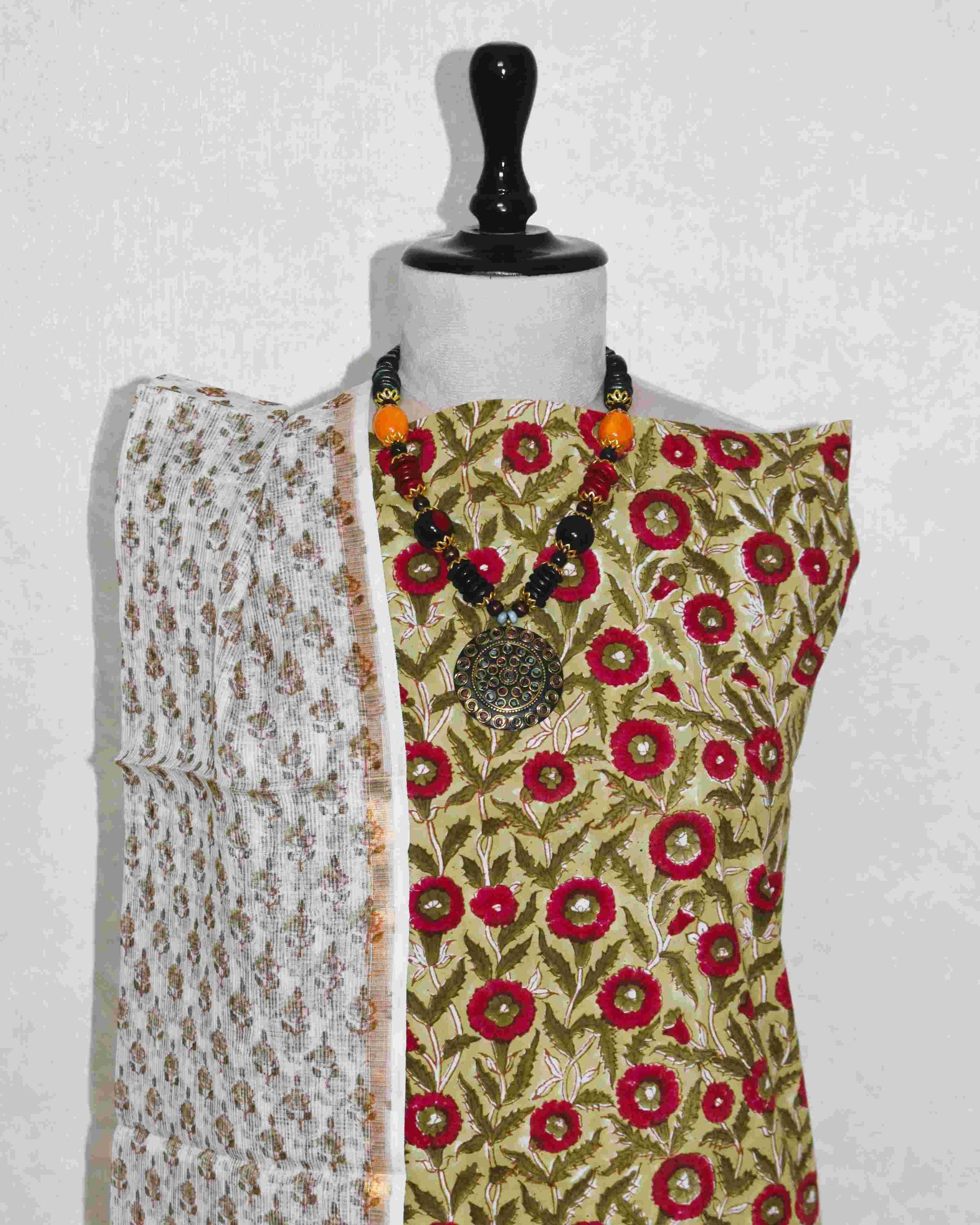 Experience understated luxury with this unstitched block printed cotton suit. Crafted from premium cotton for unmatched comfort, it lets your skin breathe all day long. The exquisite Kota Doria dupatta is airy yet refined, draping beautifully with an elegant flow. Create a silhouette that’s uniquely yours — effortless sophistication for every day.