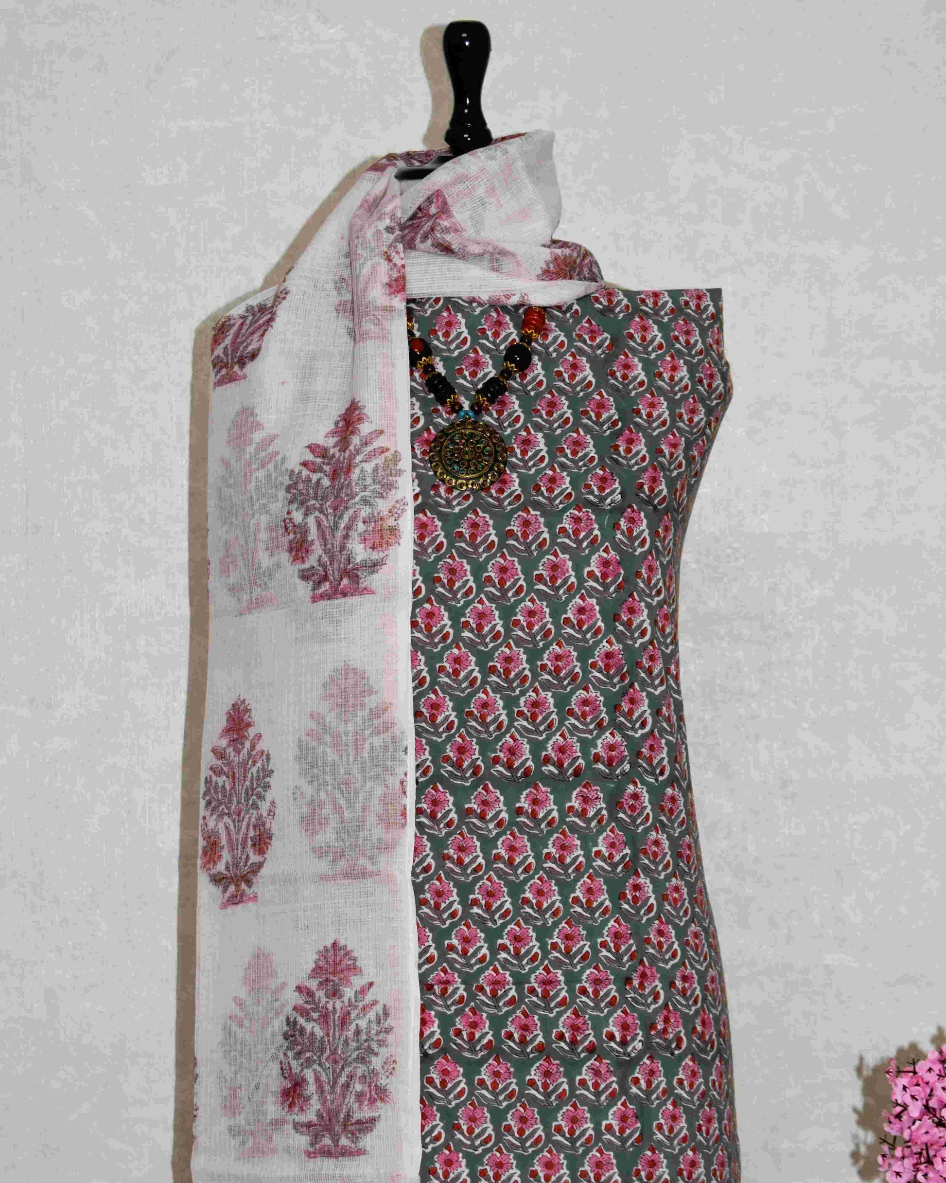 All-over Small Floral Buti Hand Block Printed Cotton Suit With Kota Doria Dupatta