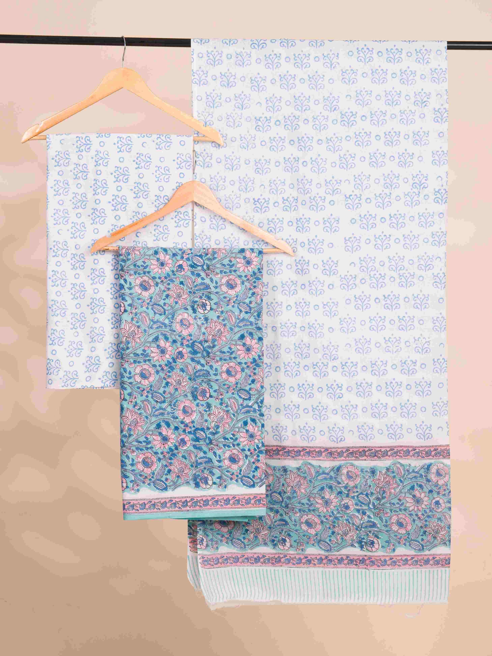 Aqua Blue All-over Floral Hand Block Printed Cotton Suit with Malmal Dupatta