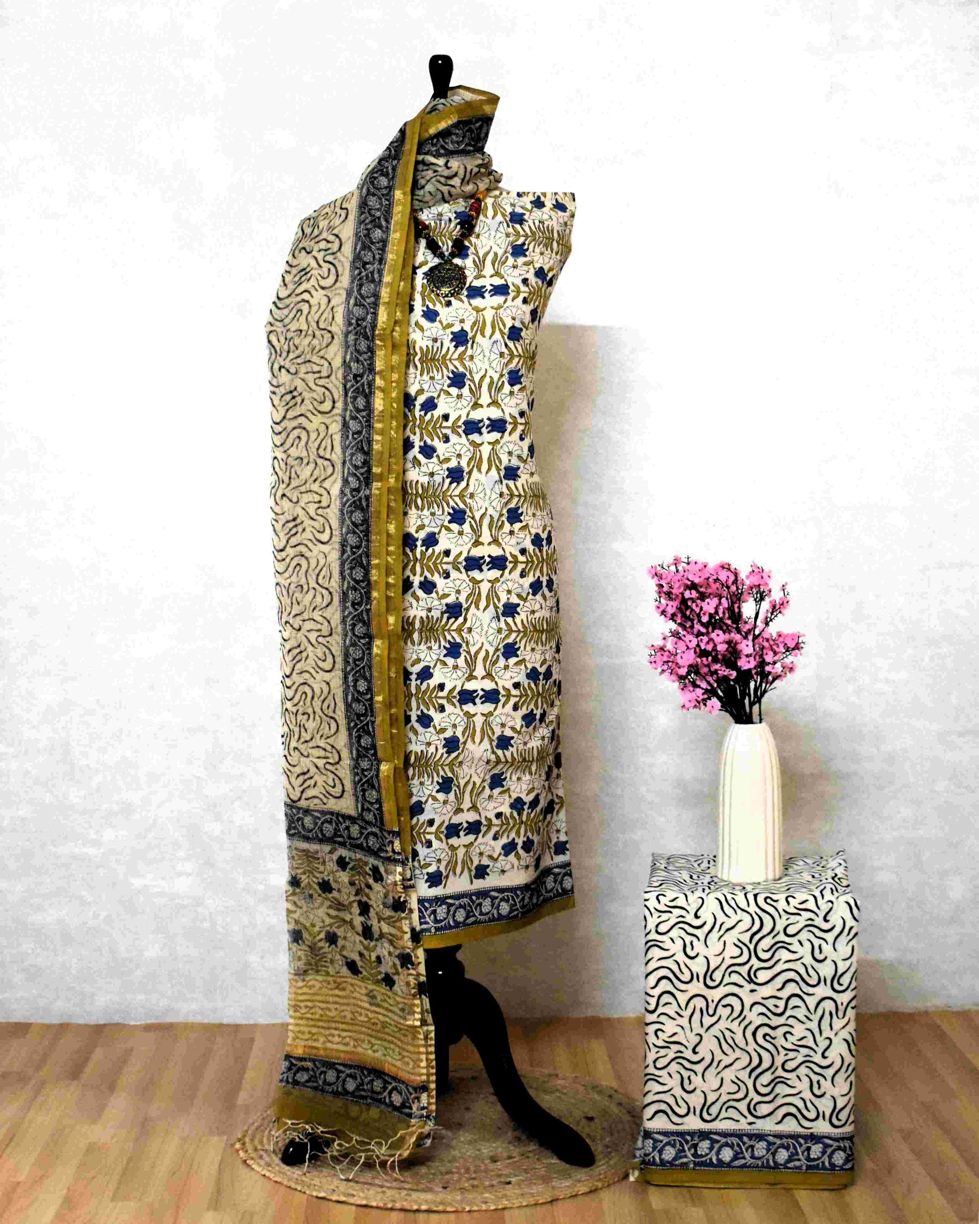 Blue Floral Jaal (BAGRU PRINT) Hand Block Printed Cotton Suit With Kota Doria Dupatta