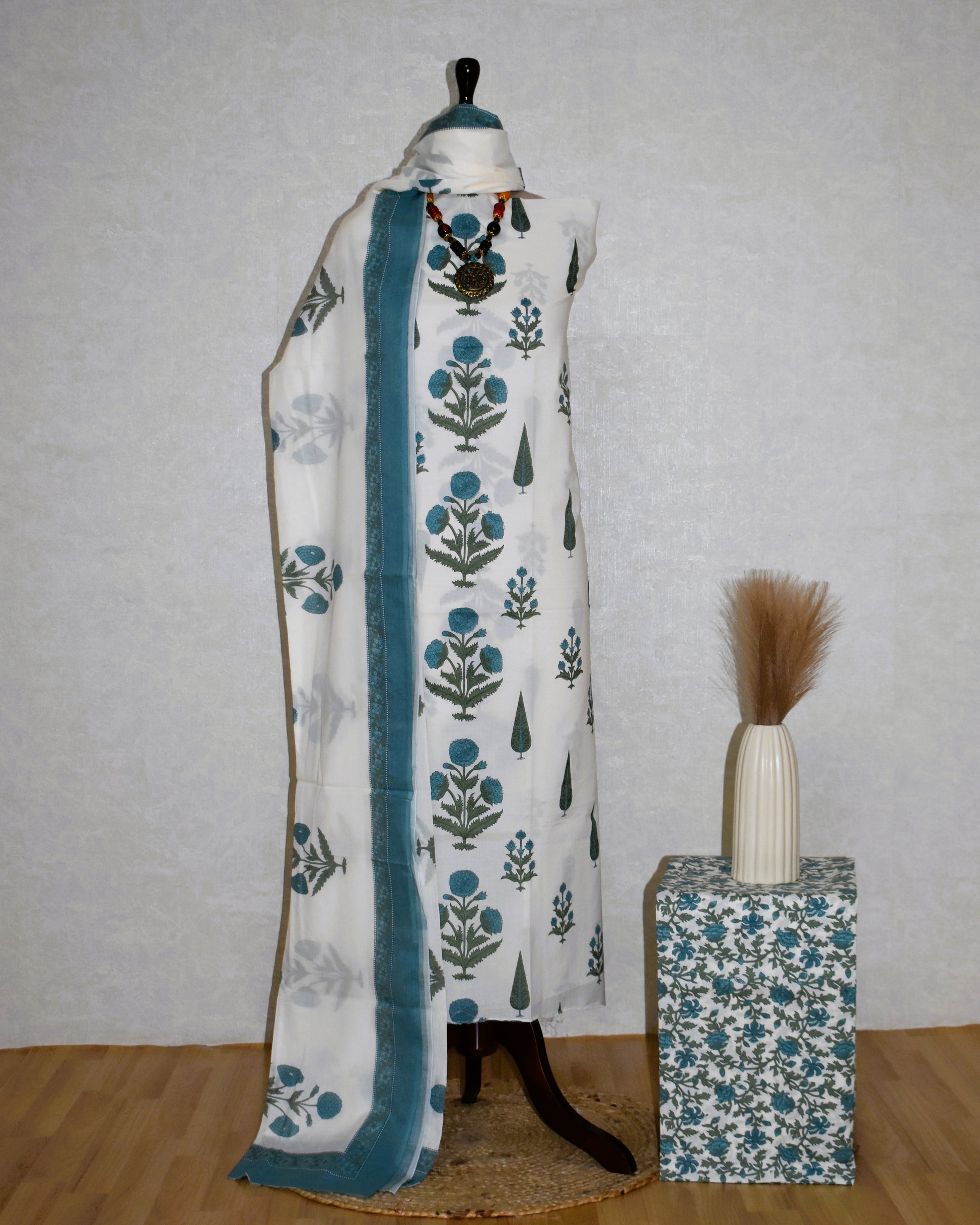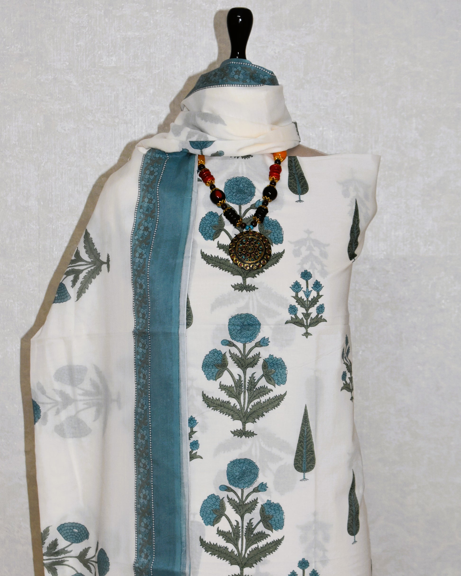 Blue Floral Jaipuri Printed Unstitched Cotton Suit Set