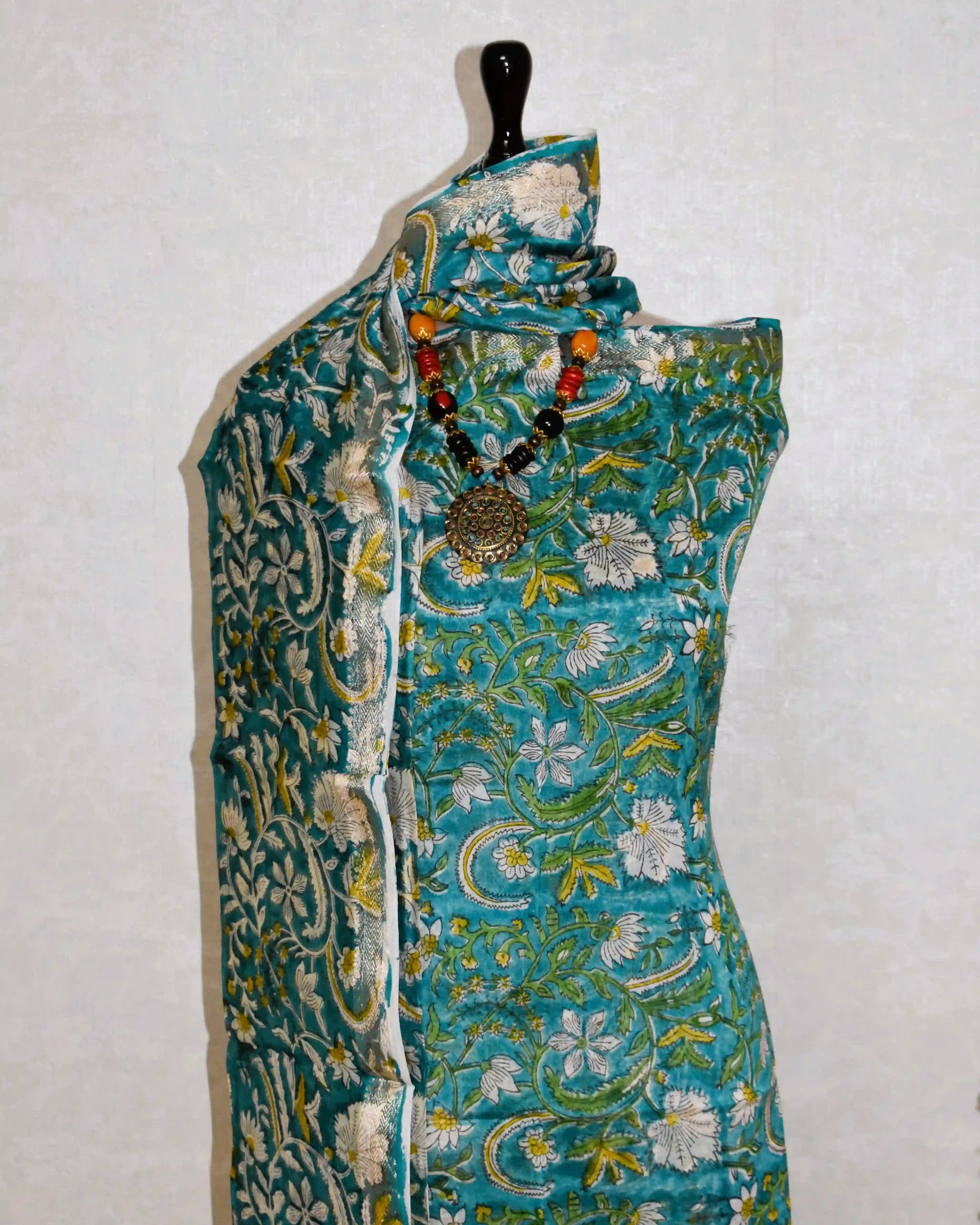 Blue-Green All-over Floral Sanganeri printed Maheshwari Silk Suit Set