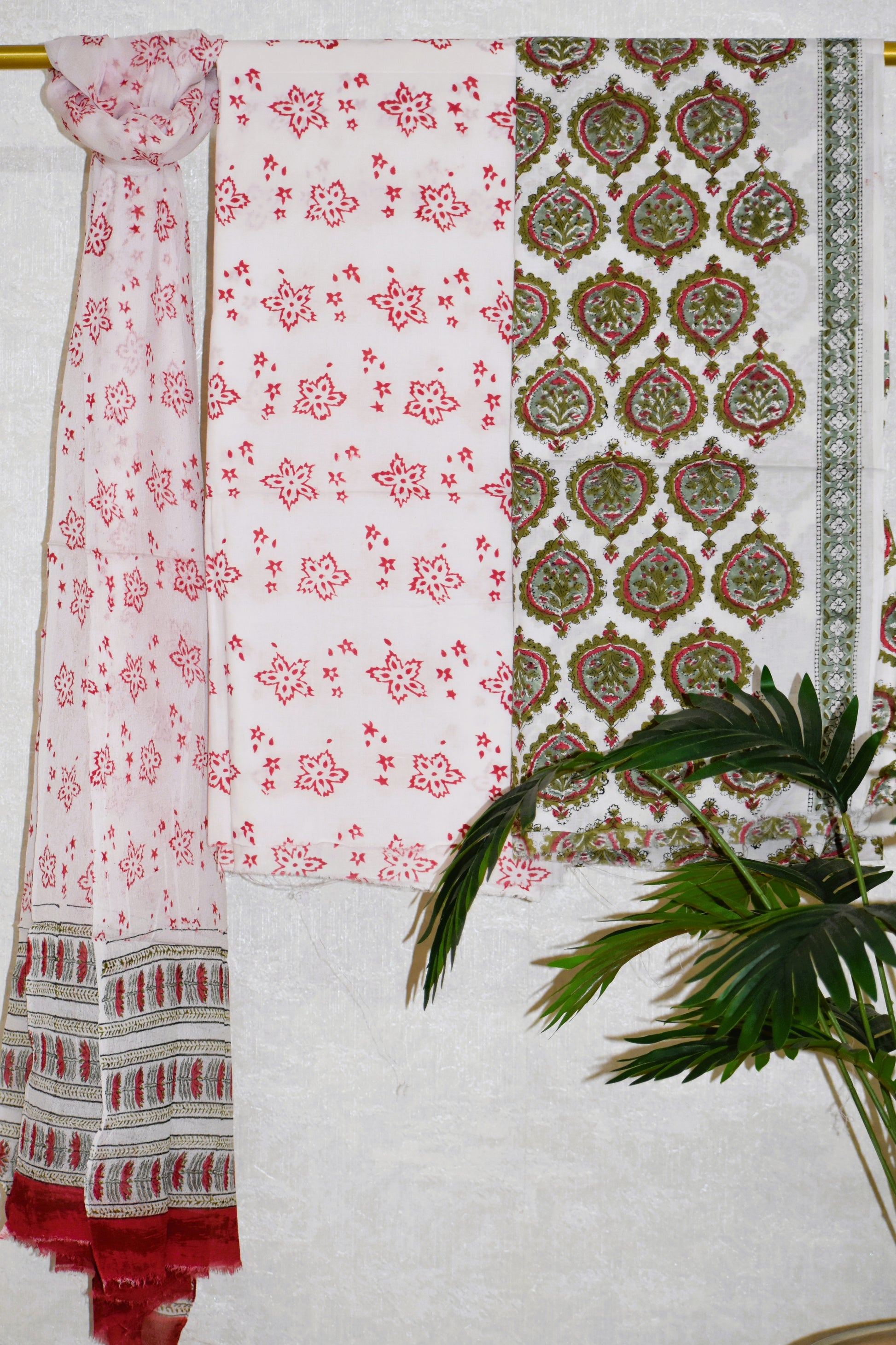 Stay effortlessly stylish and comfortable with this unstitched block printed cotton suit set, crafted from soft, breathable fabric which promises all-day ease, making it perfect for everyday wear. The lightweight chiffon dupatta adds a graceful, airy touch, draping beautifully without weighing you down. With unstitched fabric, you have the freedom to tailor it just the way you like — your comfort, your style.