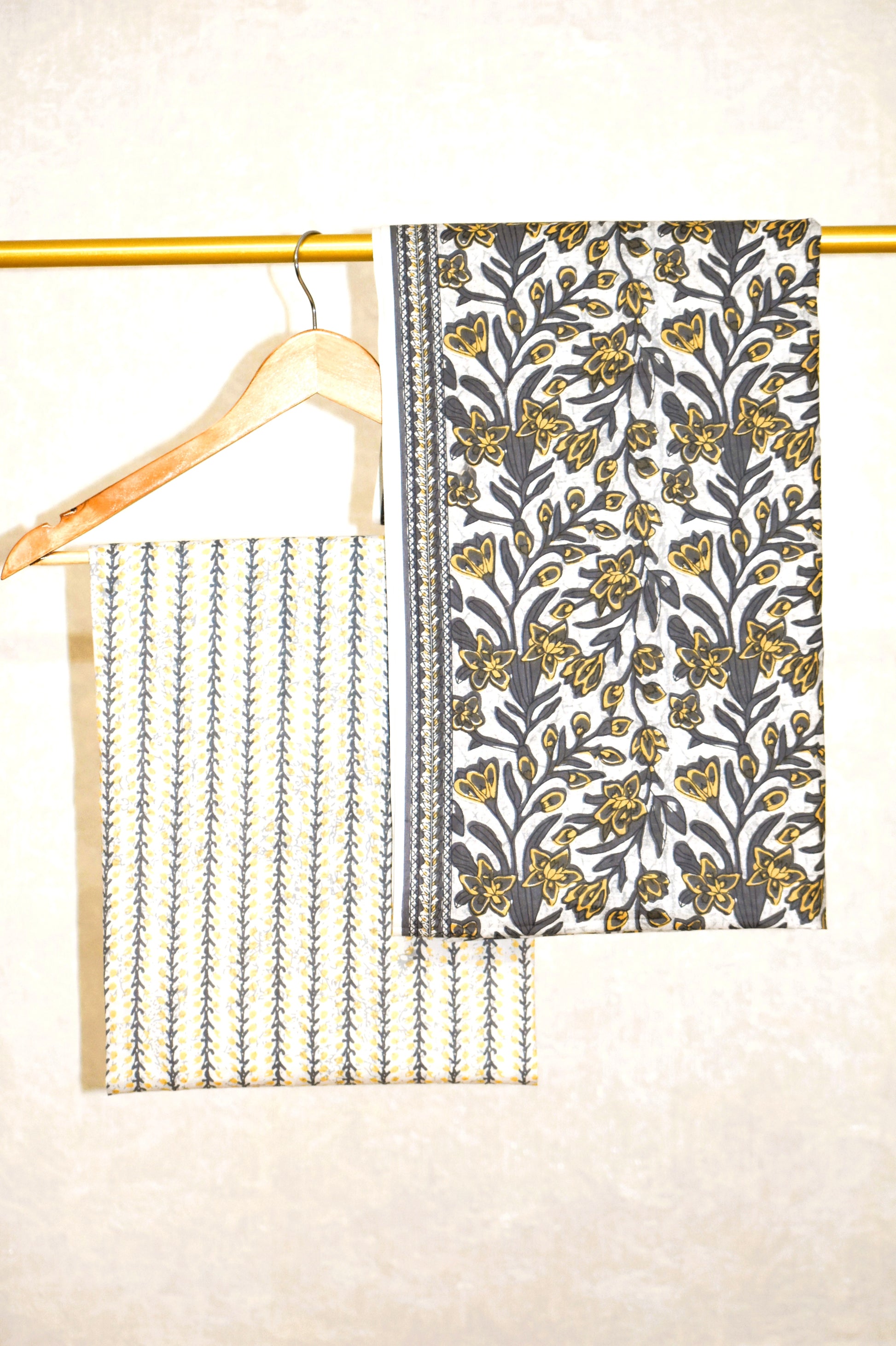 "Everyday Elegance, Jaipuri Style" Bring home the charm of Rajasthan with this unstitched cotton top and bottom combo set. Adorned with vibrant Jaipuri prints, it offers breathable comfort and a splash of traditional elegance, perfect for everyday wear or casual gatherings.