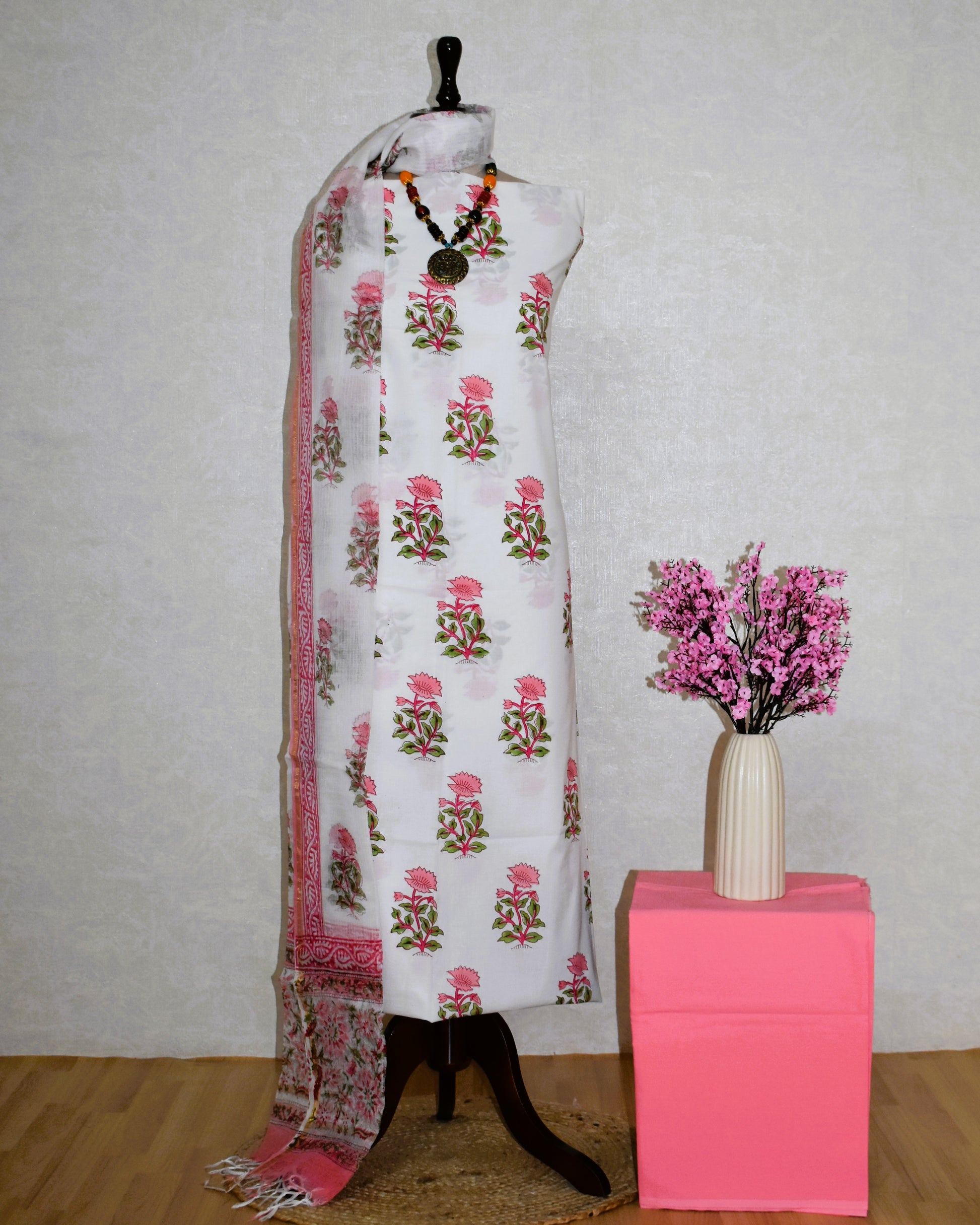 Pink Floral Hand Block Printed Cotton Suit With Kota Doria Dupatta
