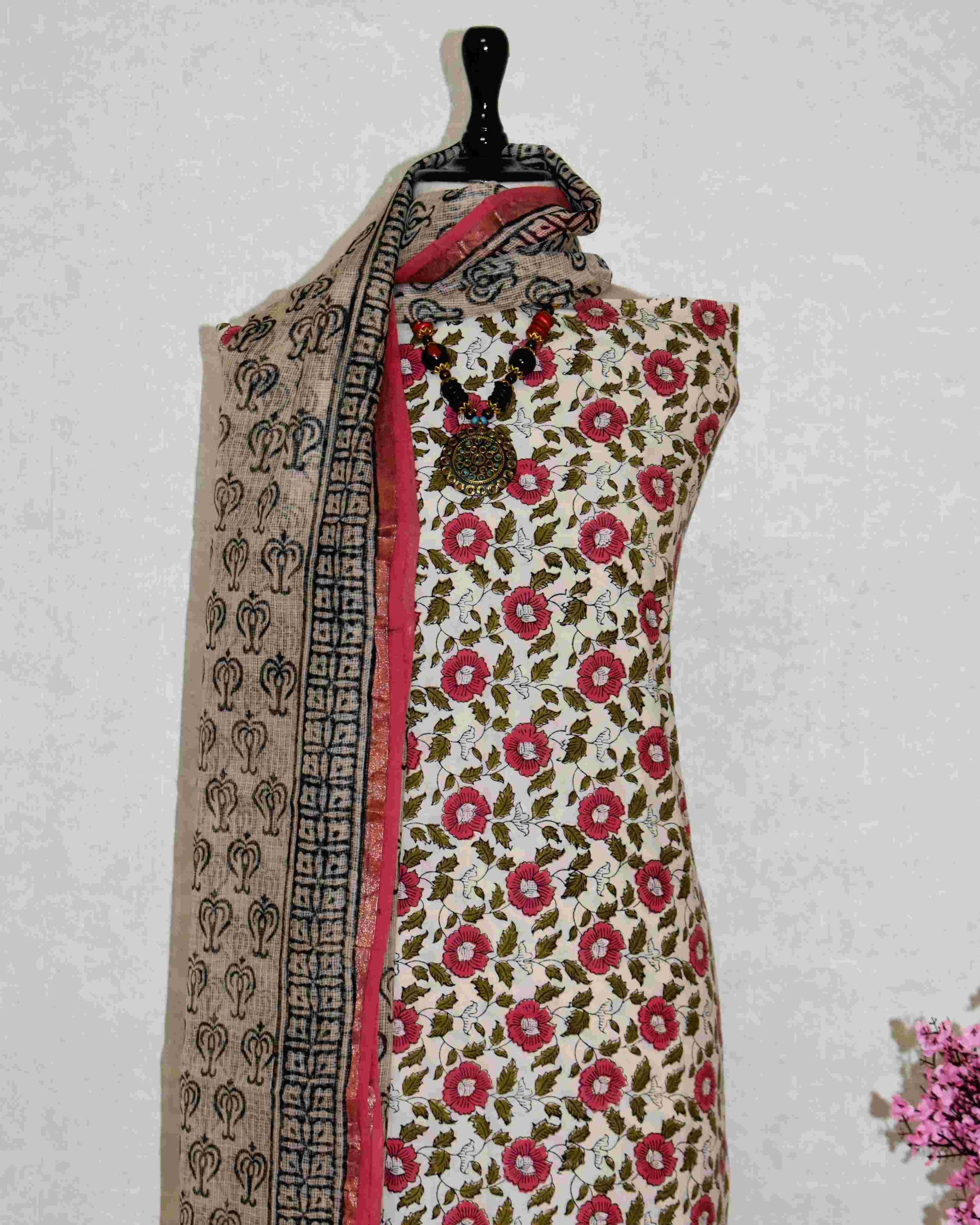 Pink Floral Jaal (BAGRU PRINT) Hand Block Printed Cotton Suit With Kota Doria Dupatta