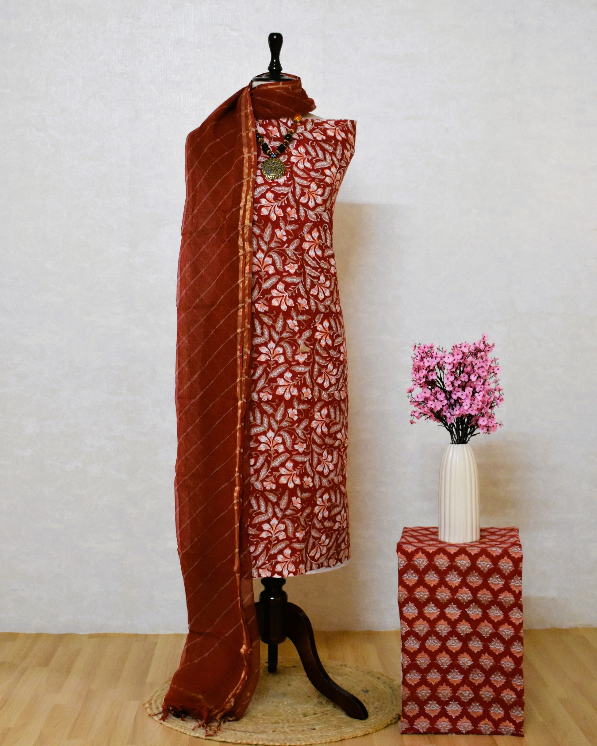 Drape yourself in the poetry of tradition with this unstitched hand block printed cotton suit, adorned with a breezy Kota Doria Leheriya dupatta. Each block print tells a story of skilled artisans, while the Leheriya’s playful stripes mirror the joyful spirit of Sawan showers. A timeless ensemble that brings a festival of colours to your monsoon celebrations.Minor colour bleeding is natural in handcrafted fabrics, We recommend washing separately.