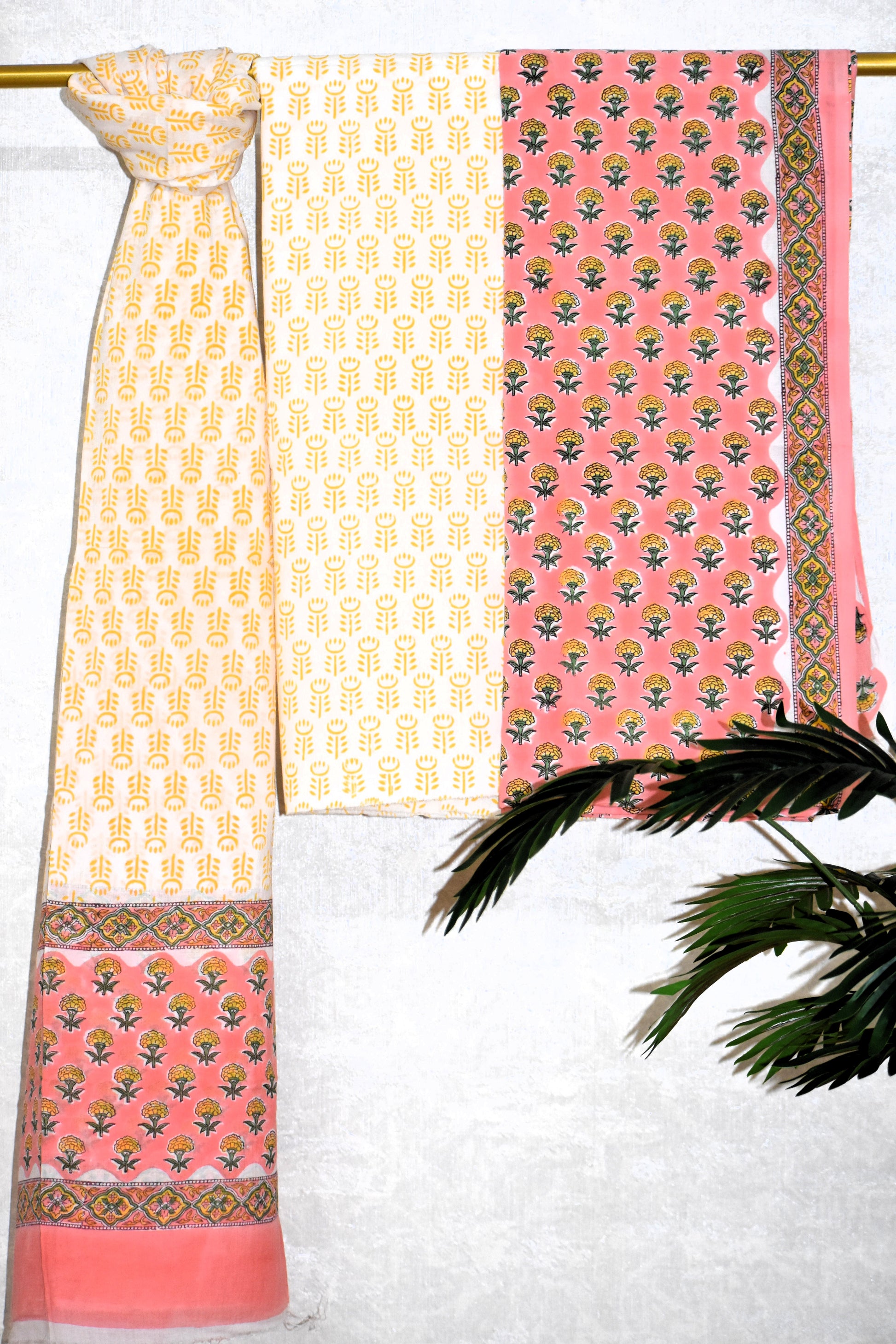 Small Floral Buti Hand Block Printed Cotton Suit With Malmal Dupatta